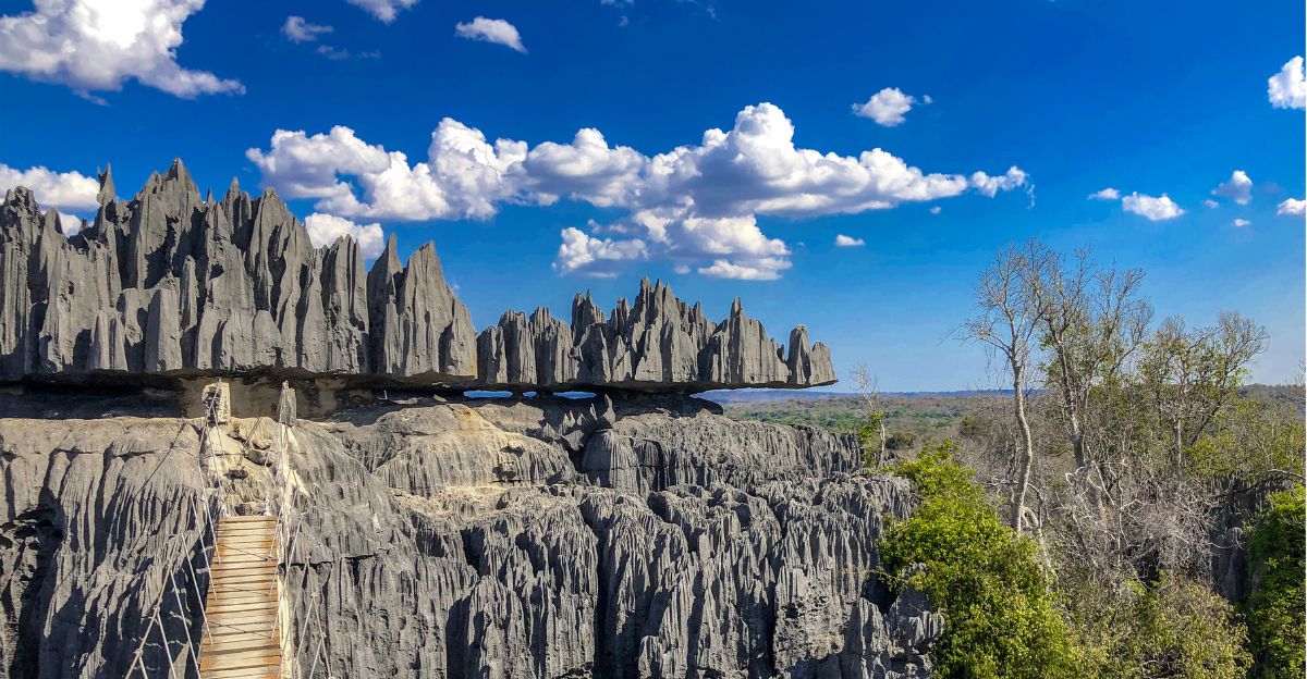 The Tsingy stone forests in Madagascar are made of tall, sharp limestone rocks that stick up like a stone jungle.