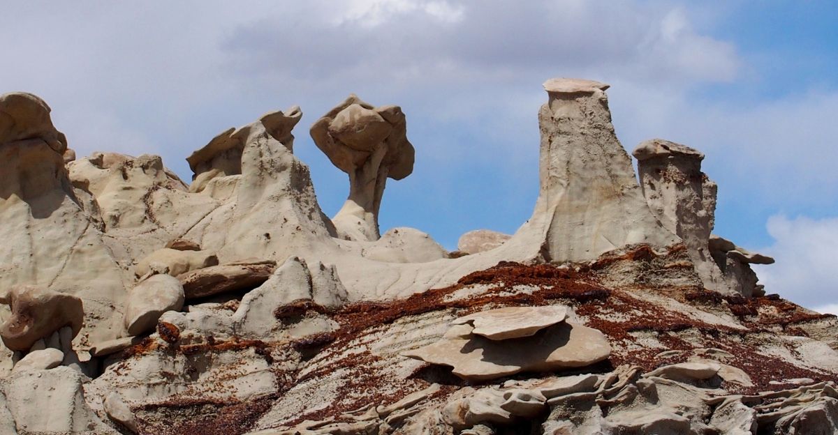 The Bisti Badlands in New Mexico are filled with odd rock shapes, tall spires, and fossilized trees. Long ago, this area was the edge of a sea called the Western Interior Seaway.