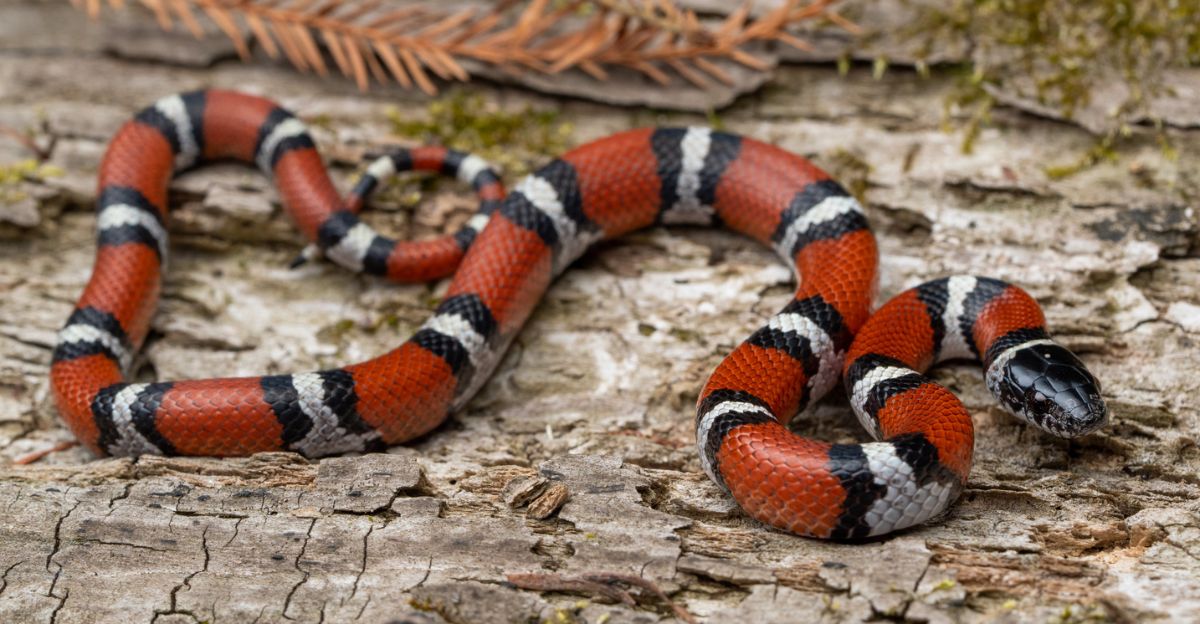 Western milksnakes inhabit eastern and central Montana, usually below 4,000 feet near grasslands and river corridors. Their bold red, yellow, and black bands closely resemble venomous coral snakes, though Montana coral snakes do not exist.