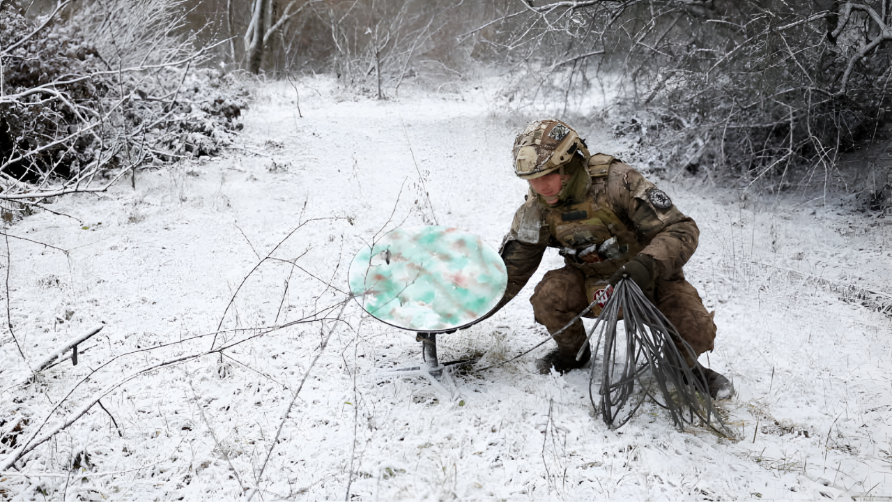 Support Forces of Ukraine soldier installing a Starlink terminal